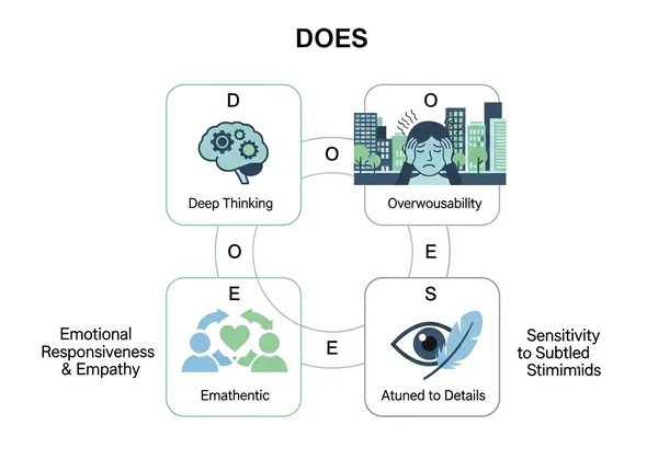To make the concept of high sensitivity easier to understand, Dr. Aron created the acronym DOES. This model outlines the four core pillars of the trait. If you identify strongly with all four, you are likely an HSP. Understanding this framework is key to interpreting your score from an HSP personality test.